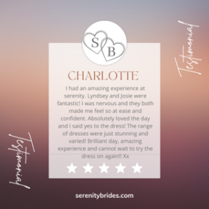 We received this lovely review from Charlotte who chose her wedding dress recently! Thank you Charlotte, we look forward to seeing you for your alterations xxx