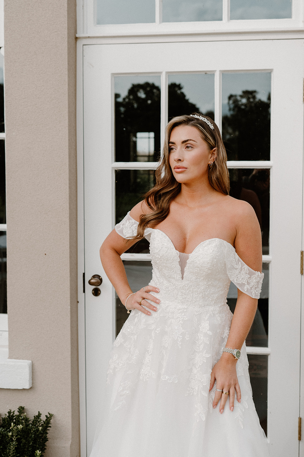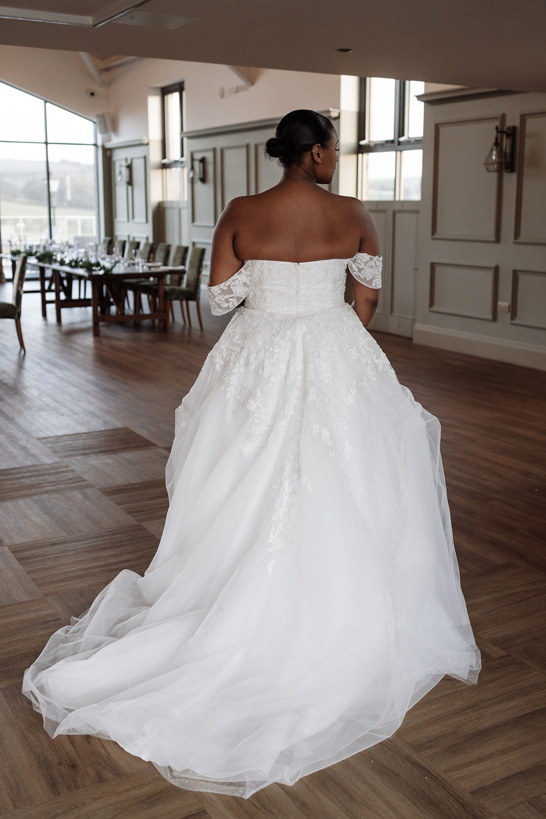 The WD148 has a plunge sweetheart bodice, adorned with floral lace that trickles down onto the flowing skirt. Finished with beaded lace appliques, and off the shoulder detailed straps for a super feminine feel. WD148 is the perfect destination dress, she was designed in a light weight lace and tulle. The silhouette fits the body yet allows effortless movement.