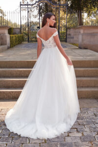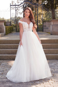 A-line gown with sheer bodice and plunging off the shoulder neckline. Bodice detailed with beaded lace appliques and a Chantilly lace underlay. Beaded trim at the natural waist leads to a tulle skirt with a sequined tulle underlay. Finished with tulle covered buttons down back bodice and a sweep length train. Raised neckline version available as 44341N.